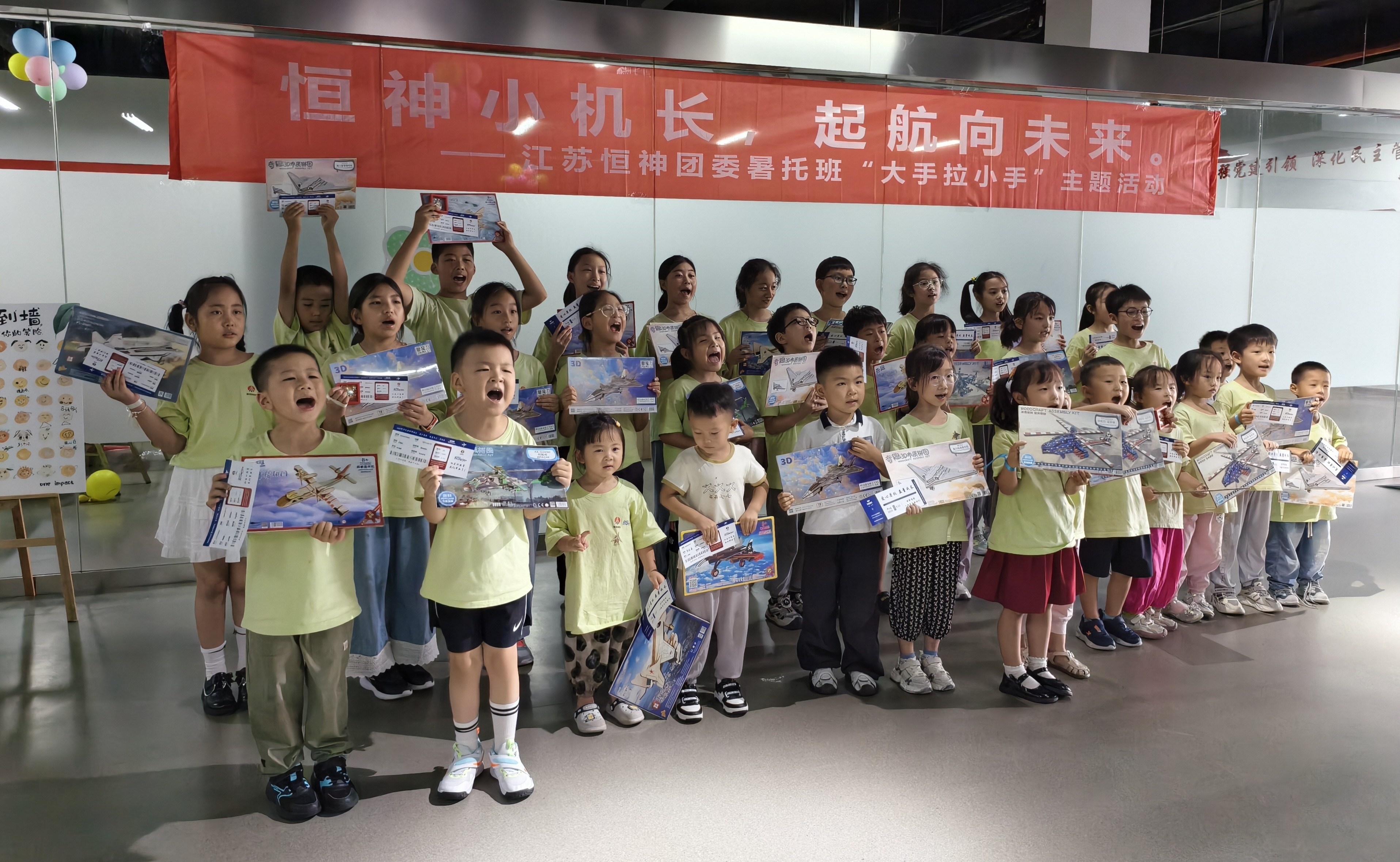 8月12日下午,恒神股份愛心暑托班的活動場地變身歡樂航空港,約50名職工子女化身 “恒神小機(jī)長”,在團(tuán)委青年們的帶領(lǐng)和陪伴下,開啟了一場充滿歡笑與成長的航空主題奇妙之旅。這場以 “恒神小機(jī)長?起航向未來” 為主題的趣味游戲活動,讓孩子們在輕松愉快的游戲中收獲了知識、初步建立了團(tuán)隊(duì)互助協(xié)作的觀念。開場破冰:舞蹈牽情誼,小隊(duì)齊集結(jié)隨著歡快的音樂旋律響起,活動正式拉開帷幕。5名團(tuán)委青年與孩子們手拉手圍成圈,跟著節(jié)奏蹦跳旋轉(zhuǎn),原本有些靦腆的小朋友們很快被活潑的氛圍感染,大廳里瞬間充滿了銀鈴般的笑聲。這場破冰舞蹈就像一根無形的線,迅速拉近了青年志愿者與孩子們的距離。在簡要的自我介紹后,大家通過抽取彩色手環(huán),分成了紅、黃、藍(lán)、綠、白五支小隊(duì),展開了一場場趣味比拼。趣味闖關(guān):航空主題游戲里的知識與協(xié)作折紙飛機(jī)環(huán)節(jié)迅速點(diǎn)燃了孩子們的激情。大家拿著 A4 紙,跟著領(lǐng)隊(duì)老師學(xué)習(xí)折疊技巧,有的還別出心裁地畫上笑臉和花紋。“三、二、一,起飛!” 當(dāng)數(shù)十架紙飛機(jī)穿過 “書架圓環(huán)” 時,大廳里爆發(fā)出陣陣歡呼。“我是拼圖小能手” 環(huán)節(jié)堪稱對 “速度與協(xié)作” 的考驗(yàn)。當(dāng)飛機(jī)拼圖被分發(fā)到各隊(duì)時,孩子們立刻圍坐在一起,七手八腳地開始拼接。“這塊應(yīng)該在這里!”“不對,看機(jī)翼的形狀!” 團(tuán)委志愿者們在旁耐心引導(dǎo),既不包辦代替,又及時給迷茫的小隊(duì)員們支招。最終,各支隊(duì)伍都順利完成了拼圖任務(wù)。“飛機(jī)連連看” 游戲成了記憶力大比拼。孩子們盯著倒扣的紙牌,時而蹙眉思考,時而拍手歡呼,團(tuán)委志愿者們則在一旁計時鼓勁、還要熱心的小朋友不時用掌聲鼓勵加油。最終,所有孩子都贏得了木制飛機(jī)模型拼圖,獲勝隊(duì)伍的小朋友還優(yōu)先挑選了心儀的款式。溫情收尾:徽章與機(jī)票見證成長,愛與理念扎根心間活動尾聲,每位小飛行員都領(lǐng)到了閃亮的 “恒神小機(jī)長” 徽章,驕傲地別在胸前。當(dāng)印有每個孩子名字的 “結(jié)業(yè)機(jī)票” 被鄭重頒發(fā)時,不少小朋友舉著機(jī)票和模型向志愿者們開心地道謝。本次活動旨在讓職工子女在歡樂中感受航空精神,同時通過青年志愿者的陪伴,傳遞企業(yè)對員工家庭的關(guān)懷。這場持續(xù)兩小時的活動,像一根堅韌的 “情感碳纖維”,將企業(yè)、家庭與孩子緊緊相連。恒神團(tuán)委的青年們用熱情與愛心,為孩子們的暑假添上了一抹明亮的色彩,也讓 “愛與未來一起飛” 的溫暖理念,深深扎根在每個人心中。